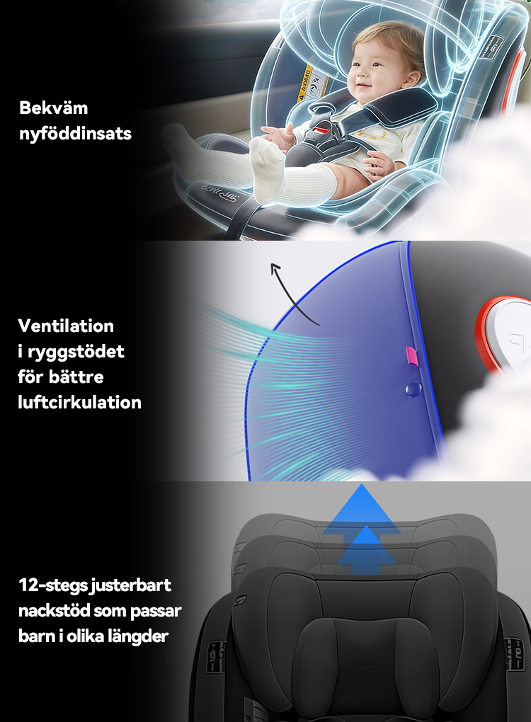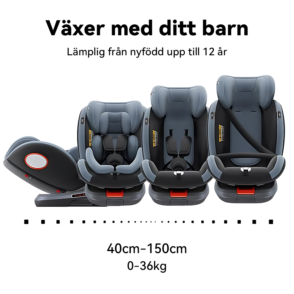Designad för att växa med ditt barn, passar denna bilbarnstol från födseln upp till 150 cm (cirka 12 år). För maximal säkerhet stöder den bakåtvänt åkande från 40–105 cm (upp till cirka 4 år), vilket ger optimalt skydd för huvud, nacke och ryggrad.