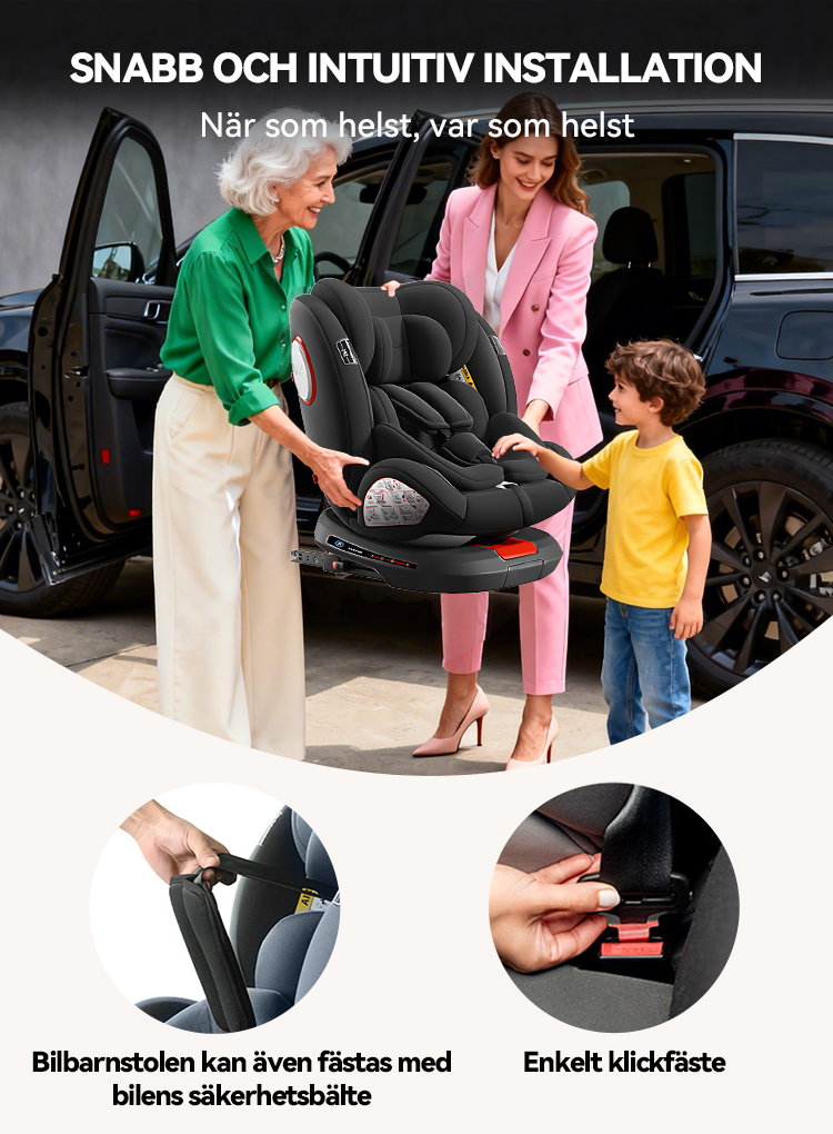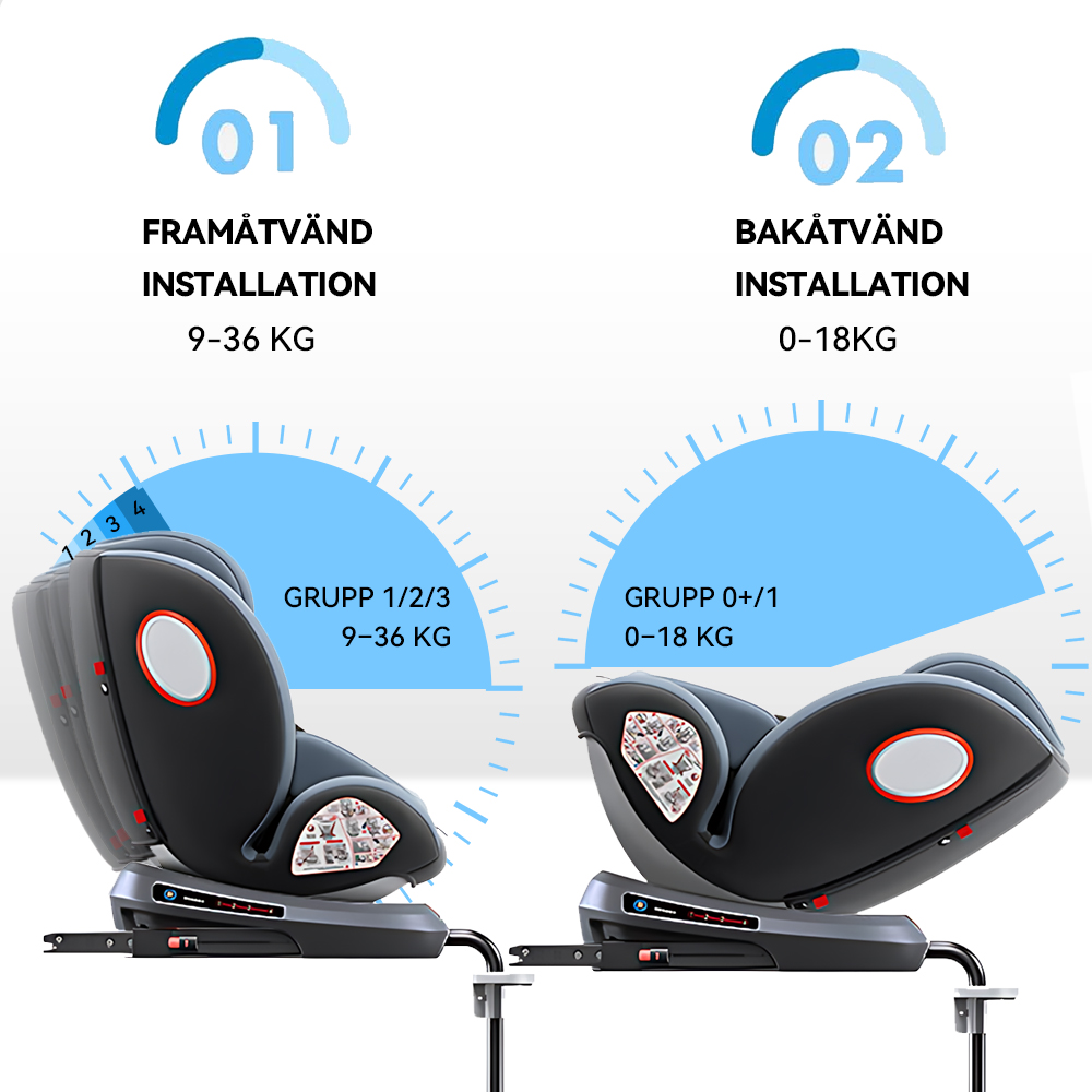Bilbarnstolen kan installeras både bakåtvänt och framåtvänt för att passa olika stadier i ditt barns utveckling. Den har även en justerbar lutningsfunktion som ökar komforten under resan. Den ergonomiska lutningen minskar obehag vid längre resor och gör det lättare för barnet att vila och sova i en hälsosam position.