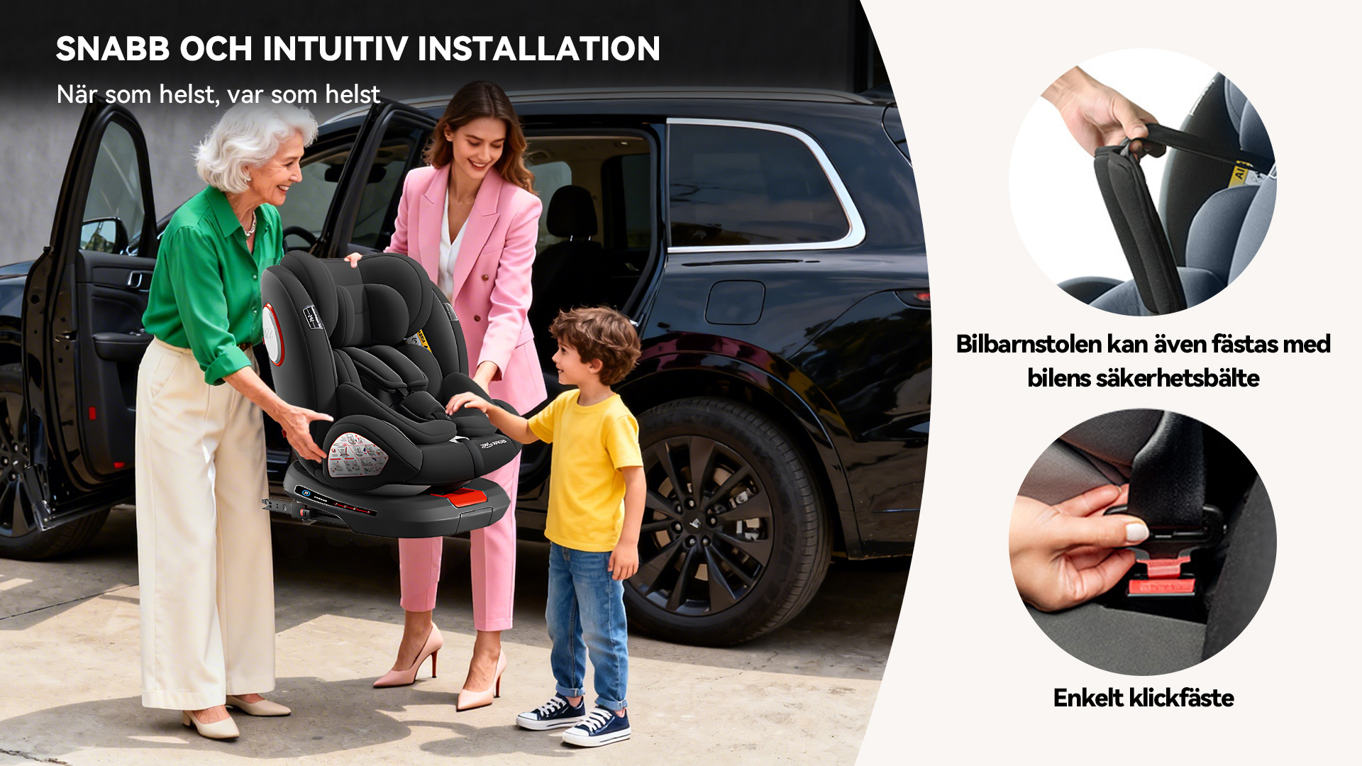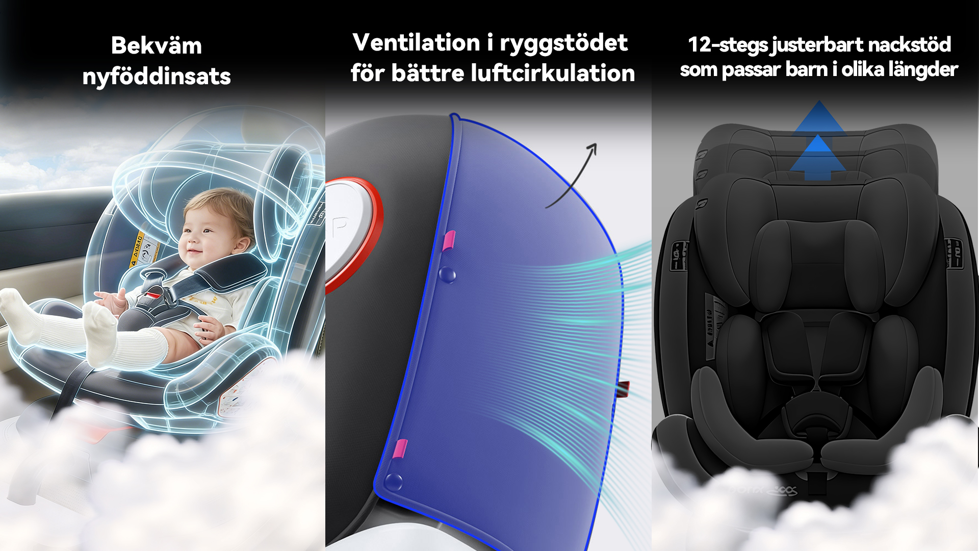Mellan 76–105 cm kan stolen användas både bakåtvänt och framåtvänt, vilket ger flexibilitet. Från 100–150 cm (cirka 4–12 år) omvandlas den till en bältesstol med ryggstöd som ger bättre sidokrockskydd än vanliga bälteskuddar.