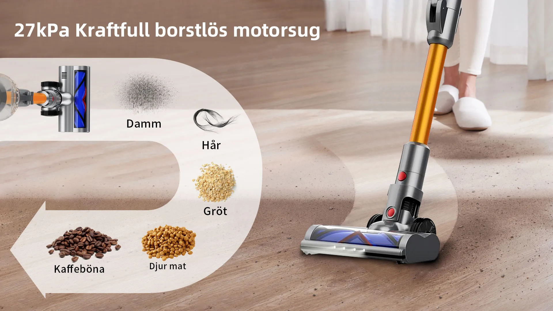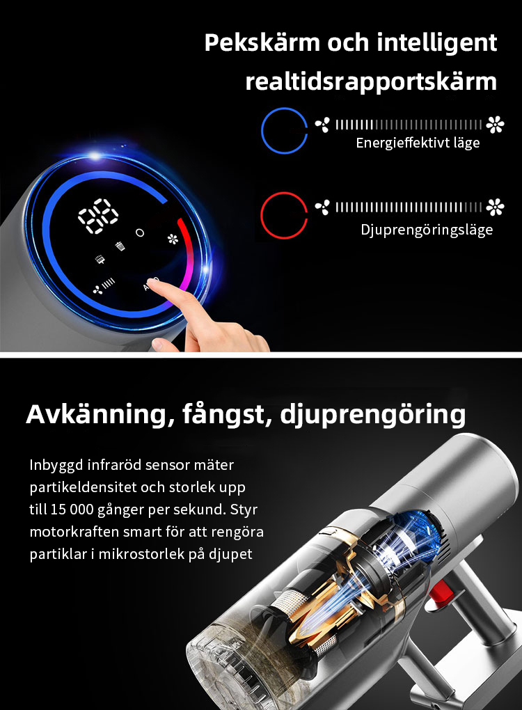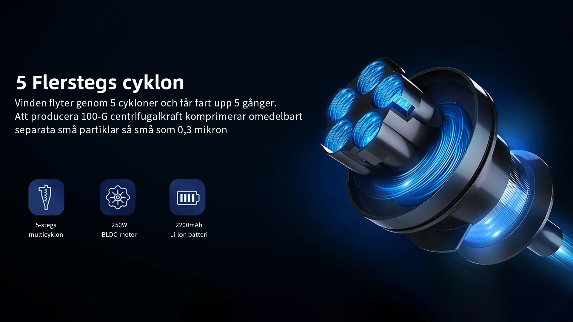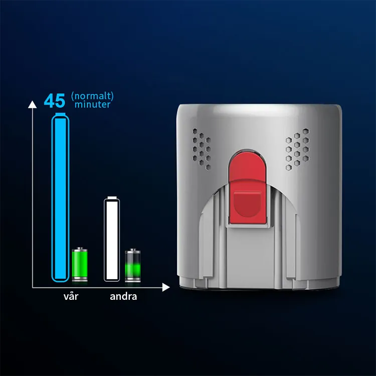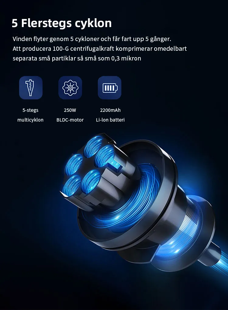 FjordSmart™s kraftfulla X9-motor roterar i mer än 135 000 varv per minut, vilket skapar ett sug på över 27 000 Pa. Den kan nästan suga upp alla typer av skräp.