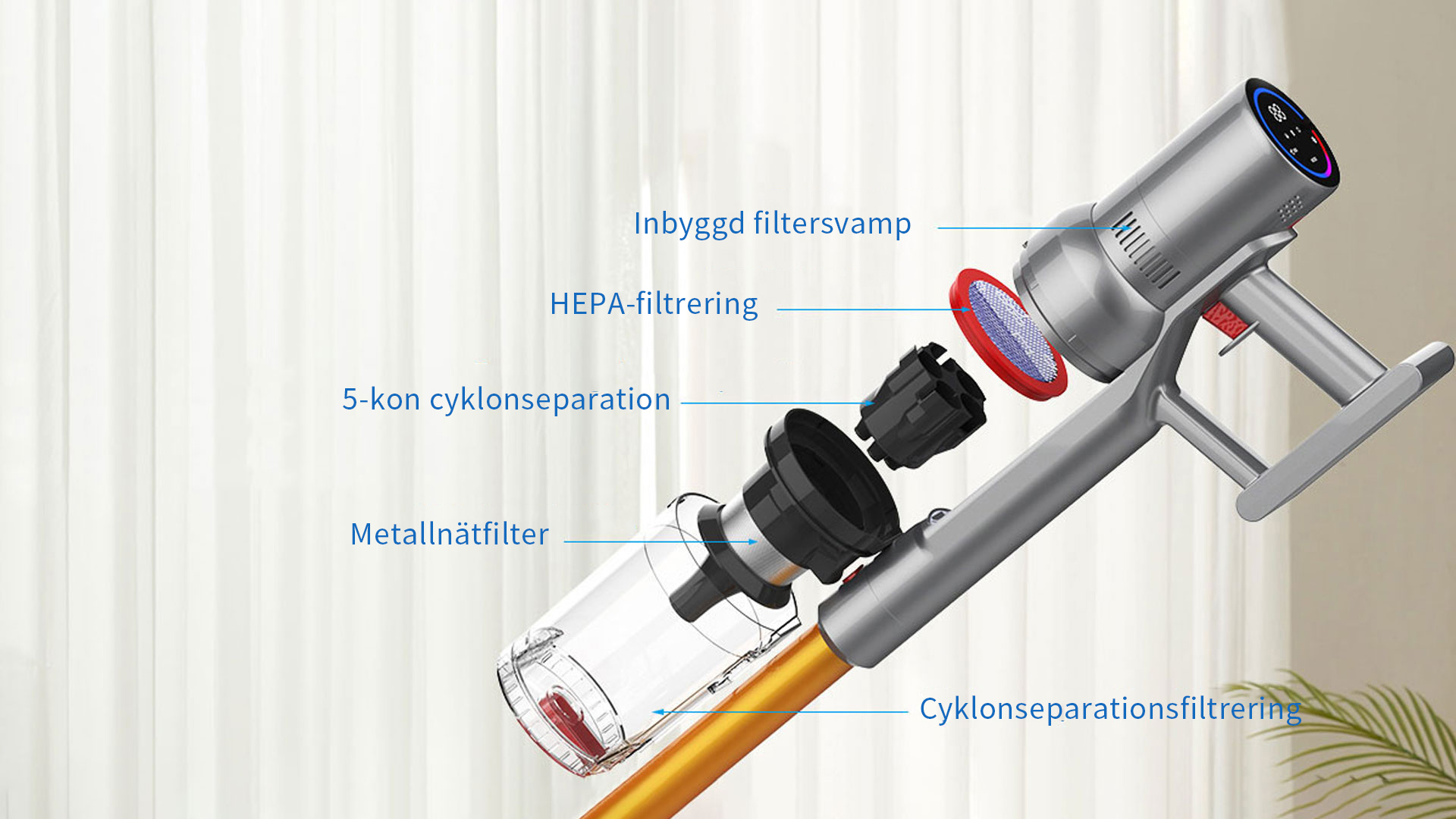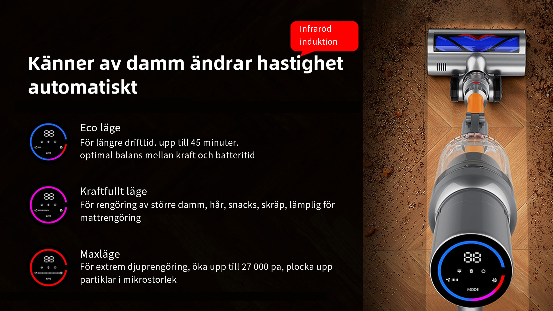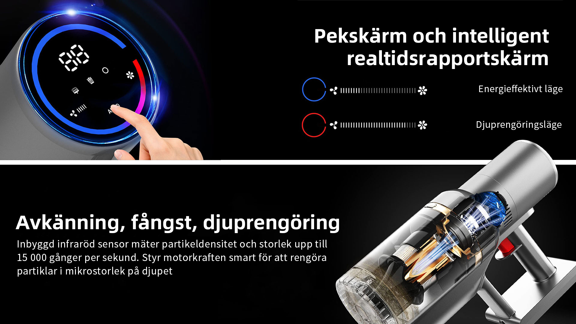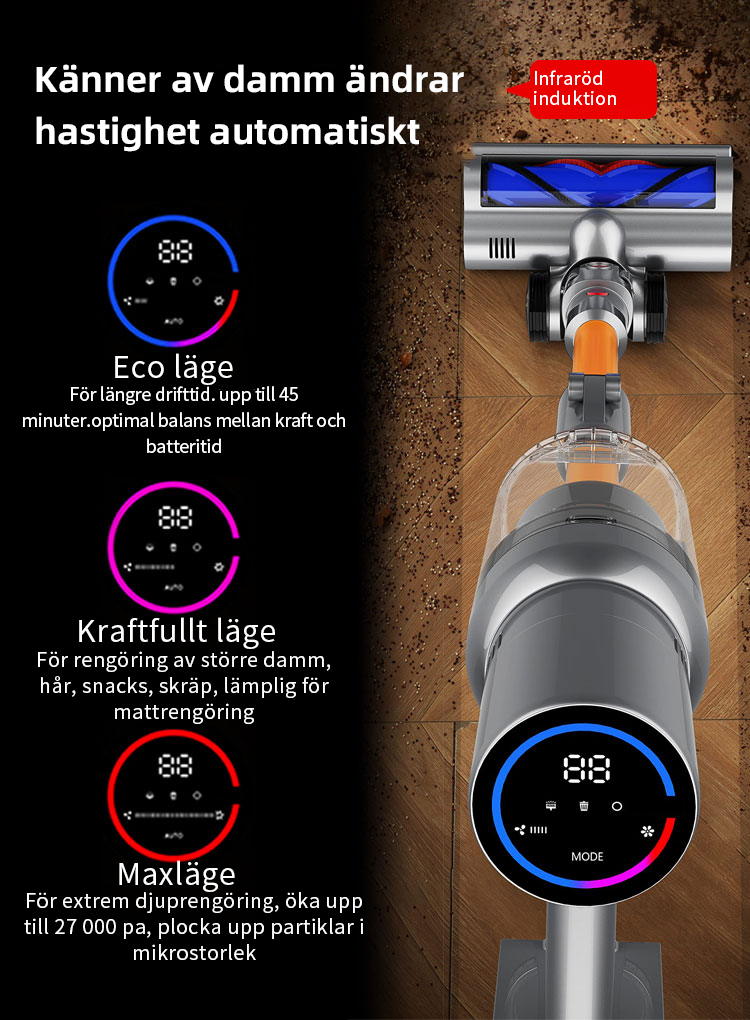 FjordSmart™s kraftfulla X9-motor roterar i mer än 135 000 varv per minut, vilket skapar ett sug på över 27 000 Pa. Den kan nästan suga upp alla typer av skräp.