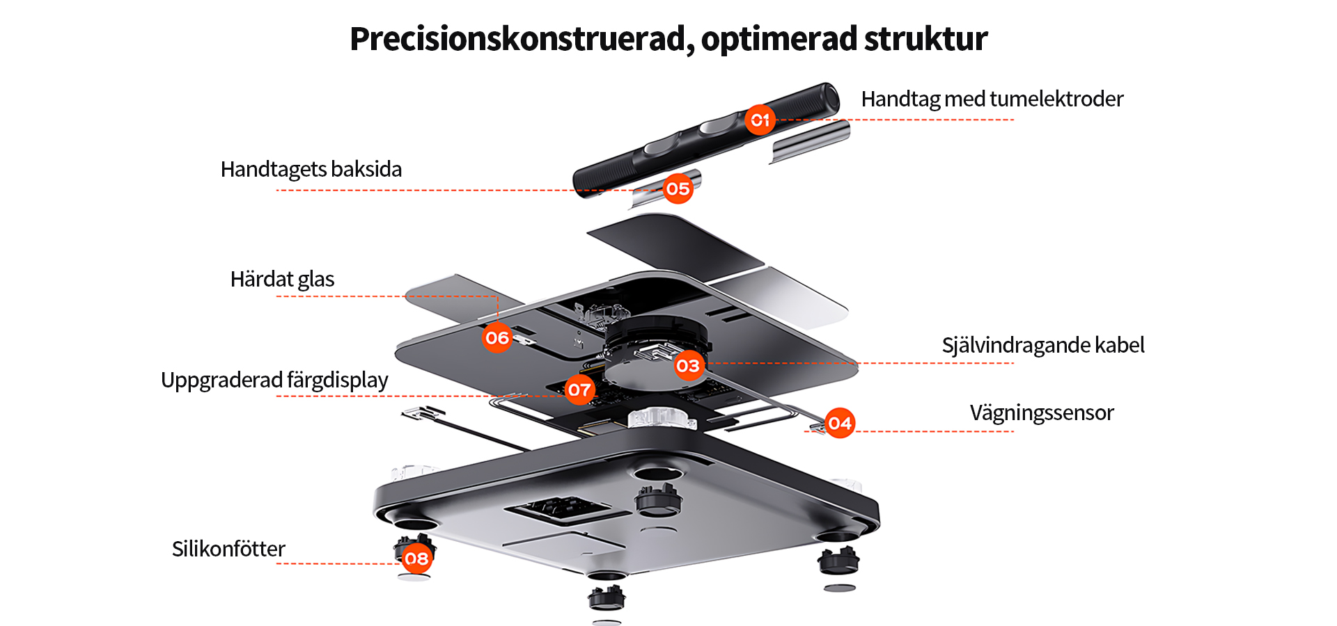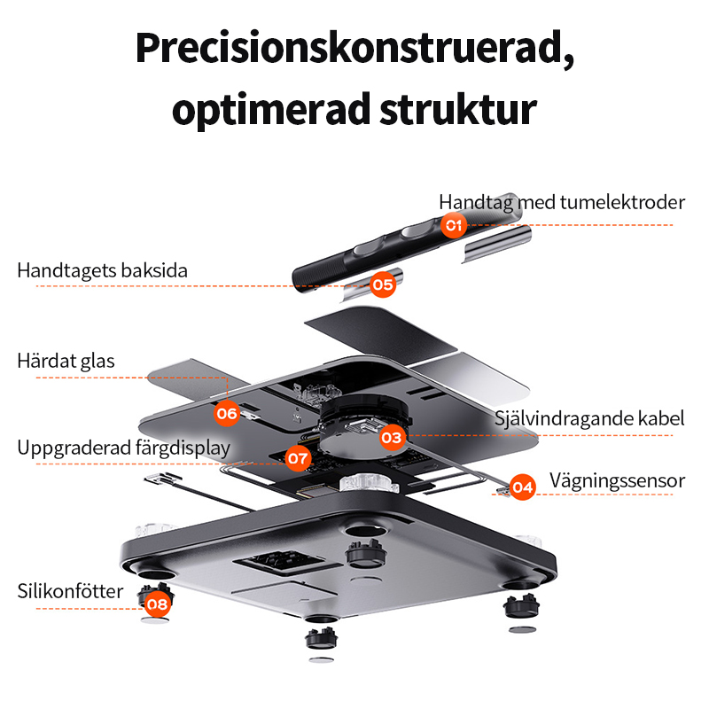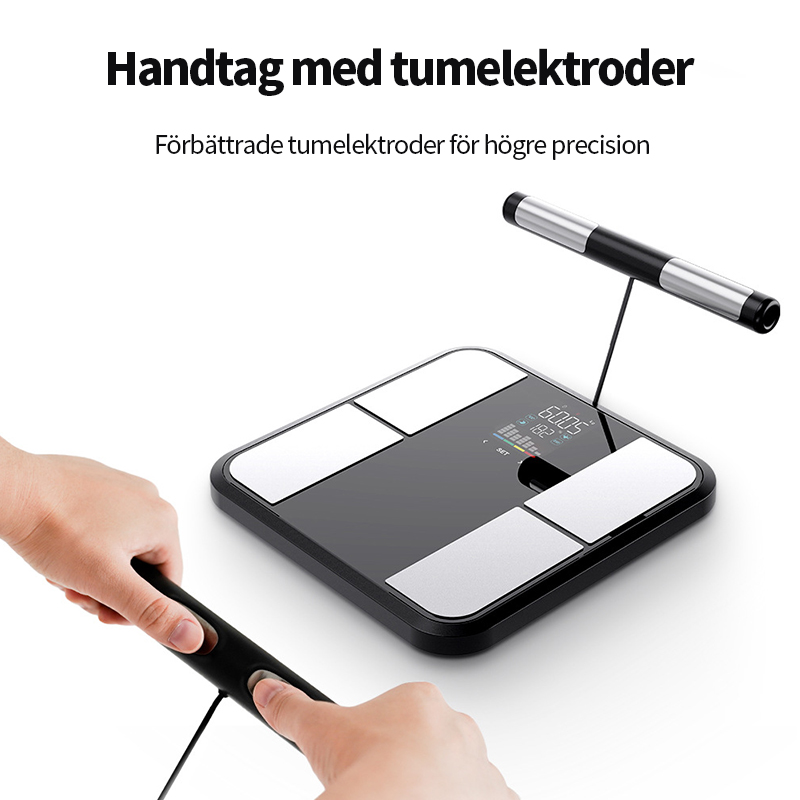 Förbättrade tum-elektroder i metall möjliggör exakt hand-till-fot-mätning av kroppens impedans, vilket ger stabilare signal och mer konsekventa data. Genom att sluta den elektriska kretsen via både händer och fötter kan vågen samla in mer detaljerad information om kroppssammansättningen och därmed ge mer noggranna mätningar, närmare professionell analys.