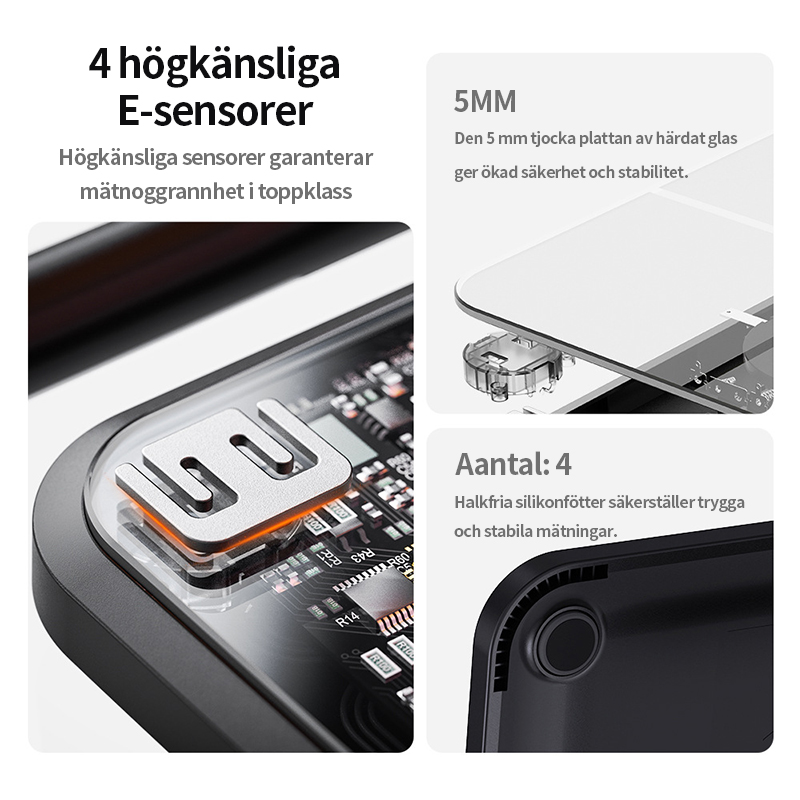 Utrustad med fyra högprecisionssensorer av E-typ som säkerställer konsekventa och exakta mätningar varje gång. Plattformen i 5 mm härdat glas ger hög styrka och stabilitet, medan halkfria silikonfötter håller vågen stadigt på plats för trygg och säker vägning på alla badrumsgolv.