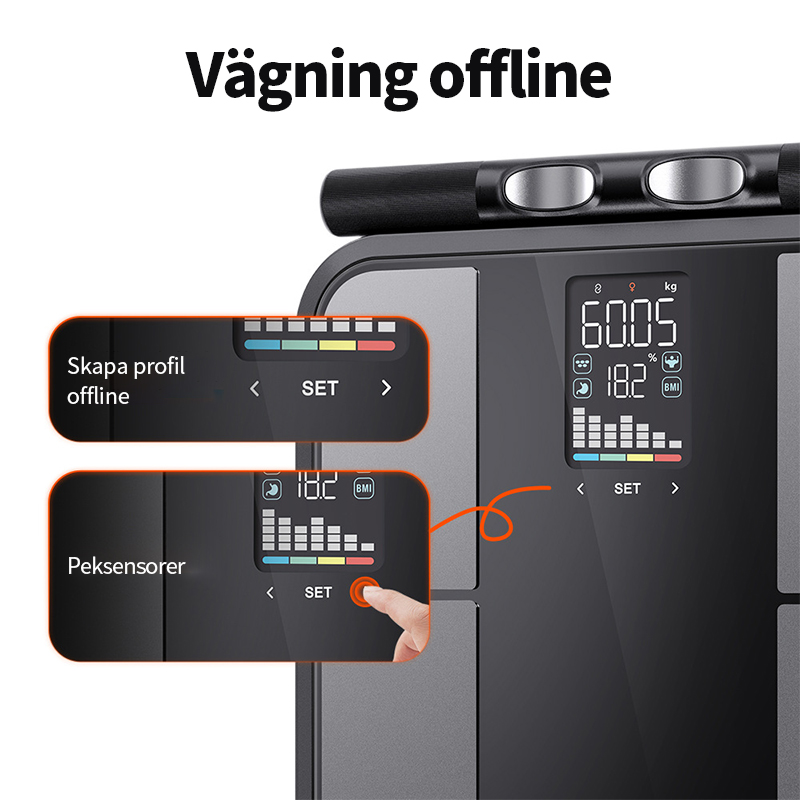 Skapa användarprofiler direkt på vågen och registrera mätningar utan att ansluta till appen. Med responsiva touchkontroller blir offline-vägning snabb och intuitiv – perfekt för daglig användning, hushåll med flera användare eller när mobilen inte finns i närheten. När appen ansluts igen synkroniseras dina data automatiskt.