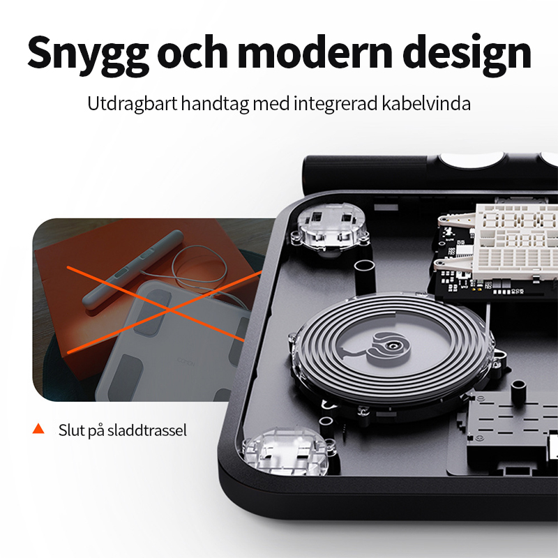 Modern minimalistisk design kombineras med praktisk funktion. Det utdragbara handtaget har integrerad kabelförvaring som håller allt snyggt organiserat och eliminerar lösa kablar. Ren, kompakt och genomtänkt design som passar perfekt i både badrum och hemmagym.