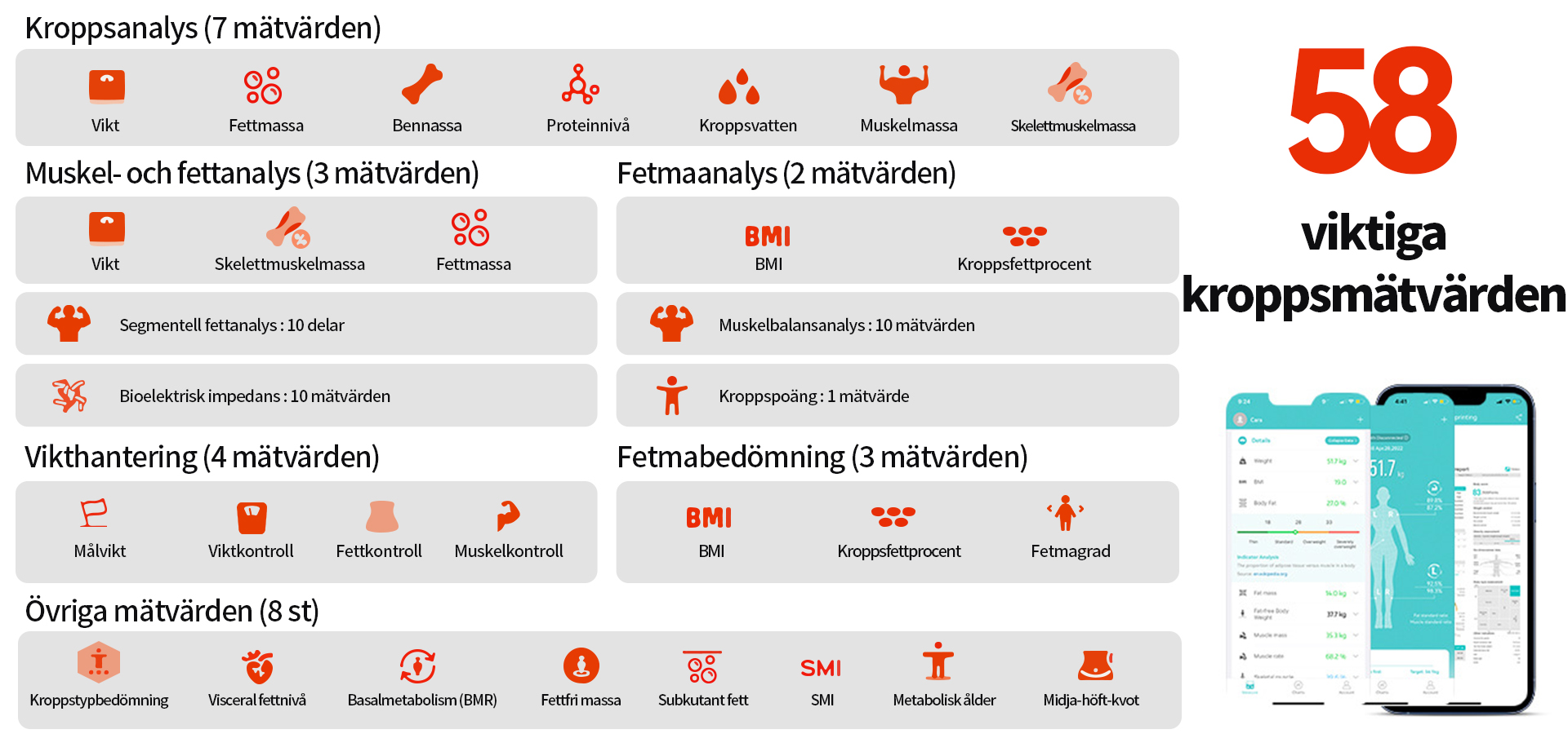 Drivs av en avancerad kroppsfettalgoritm benchmarkad mot professionella referensstandarder. Vågen ger djupare insikt i viktiga kroppssammansättningsvärden. Följ utvecklingen av fettmassa, visceralt fett (VAT), bentäthet (BMD) och total muskelmassa för att bättre förstå hur kroppen förändras bortom enbart vikt.